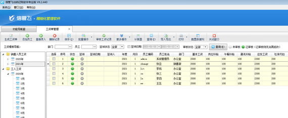 信管飛出納記賬軟件專業版包括工資管理功能,支持自定義工資模板,可根據設置的工資模板快速生成工資單,支持從上月工資單復制工資項目數據,工資項目數據錄入完成核對無誤后審核生效,審核后不再支持直接修改。如果工資記錄較多,逐條審核工資記錄會比較耗時,軟件支持批量審核工資記錄,可節省時間提高工作效率。本篇文章介紹一下出納記賬軟件中如何批量審核工資記錄? &nb