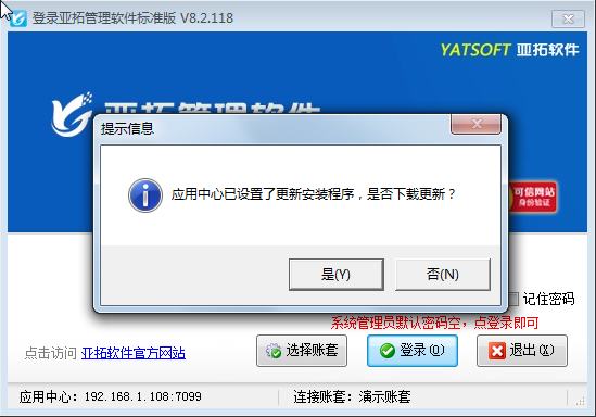 亞拓管理軟件專業(yè)版、標(biāo)準(zhǔn)版、星光版都支持網(wǎng)絡(luò)版(即可以多臺(tái)機(jī)器同時(shí)使用,數(shù)據(jù)共享,數(shù)據(jù)集中存儲(chǔ)在一臺(tái)機(jī)器上)。為了更好為客戶提供精細(xì)化的管理軟件,我們會(huì)不定期的升級(jí)軟件程序,網(wǎng)絡(luò)版多臺(tái)電腦使用的時(shí)候,每次更新程序需要每臺(tái)電腦都下載最新版安裝程序進(jìn)行安裝,非常麻煩。亞拓管理軟件支持在應(yīng)用中心設(shè)置指定更新程序路徑,客戶端程序在登錄的時(shí)候,如果檢測(cè)到版本號(hào)與應(yīng)用中心的